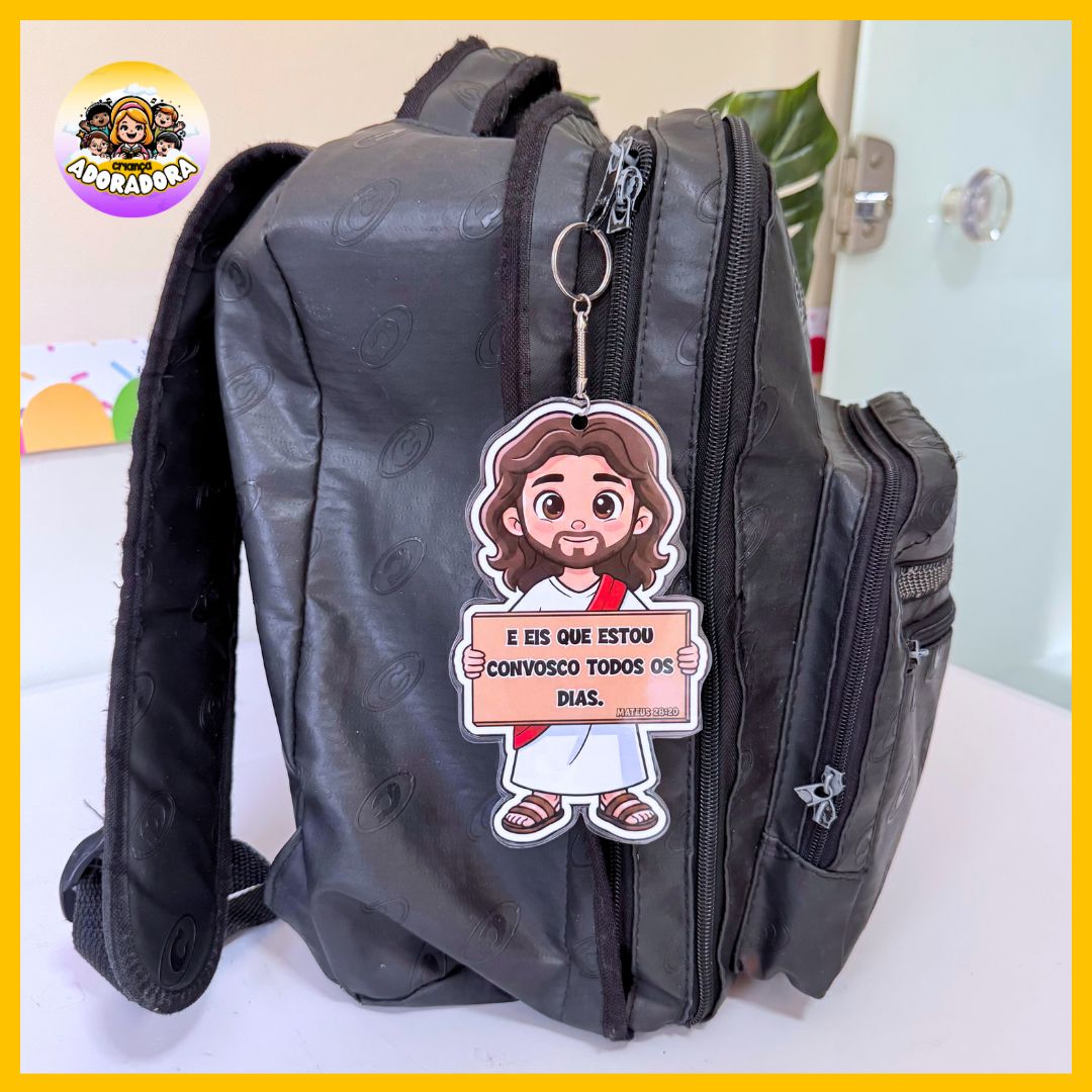 Com a imagem de Jesus e um versículo bíblico, ele lembra às crianças que Jesus está sempre ao seu lado, cuidando, protegendo e acompanhando cada passo, inclusive na escola.