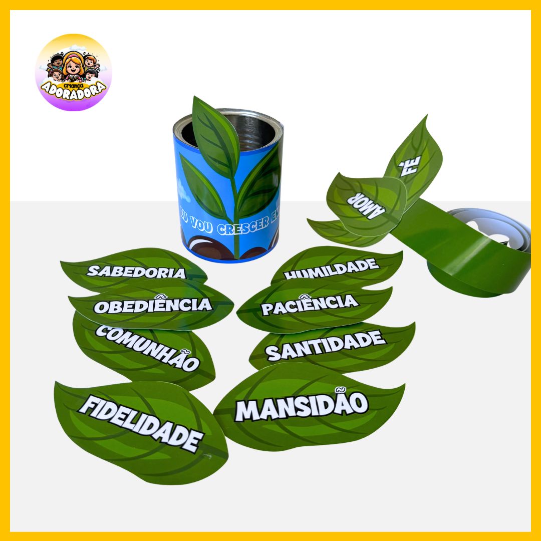 – FOLHINHAS COM PALAVRAS BÍBLICAS: sabedoria, mansidão, fidelidade, paciência, obediência, santidade, comunhão, humildade, amor e fé.
