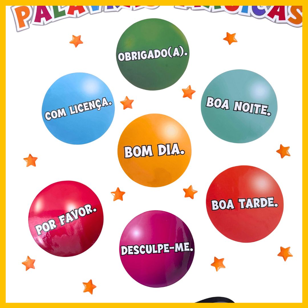– 7 BOLAS COLORIDAS COM AS PALAVRAS MÁGICAS: POR FAVOR; COM LICENÇA; DESCULPE-ME, OBRIGADO(A); BOM DIA; BOA TARDE E BOA NOITE.